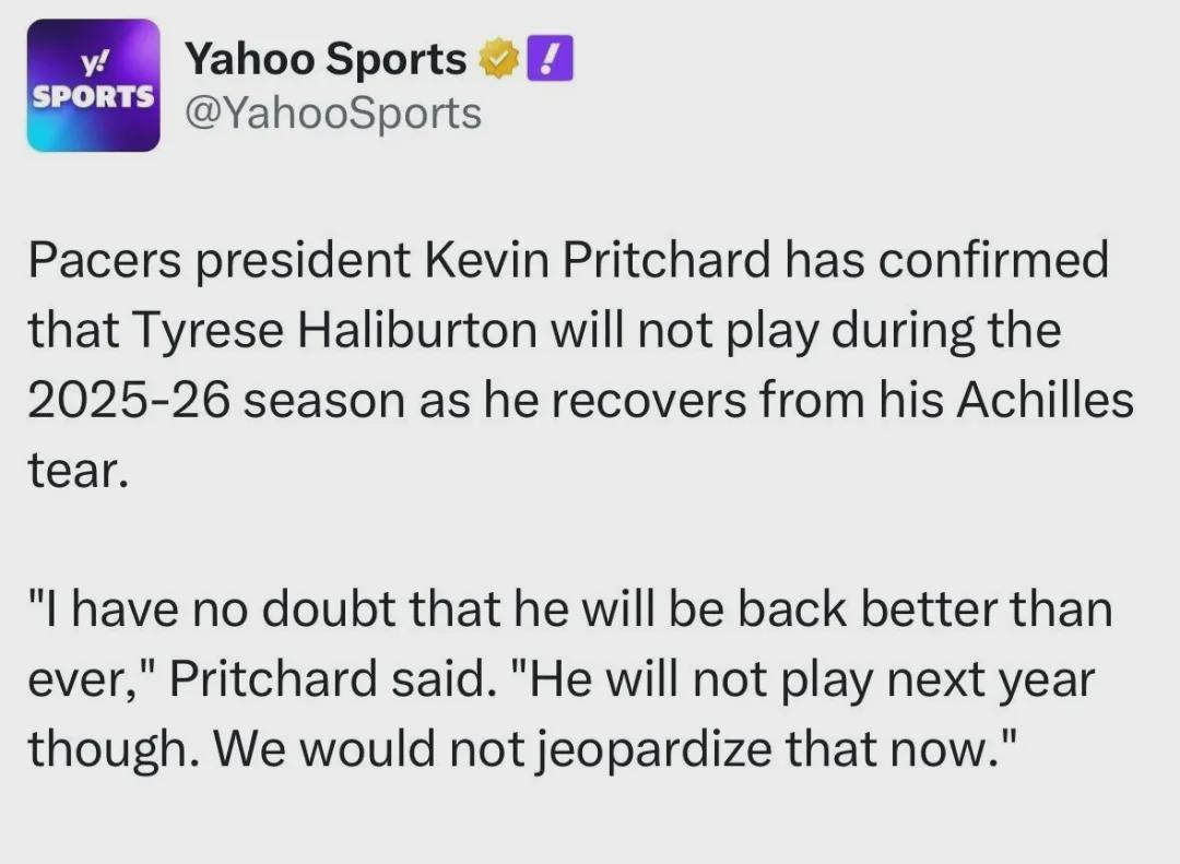 步行者总裁凯文-普理查德宣布:哈利伯顿将缺席整个25-26赛季。