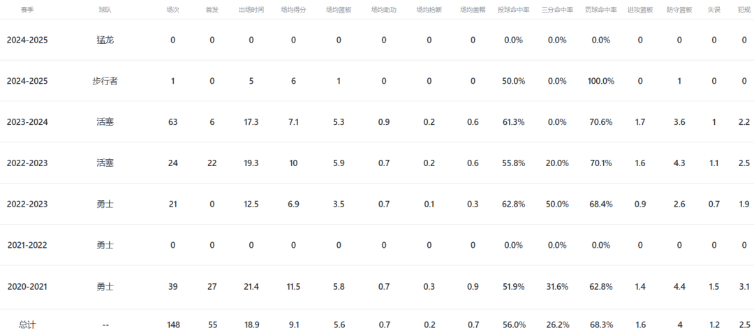 迄今为止的NBA生涯,怀斯曼常规赛场均出战18.9分钟,得到9.1分5.6板,取得的最硬荣誉莫过于21-22赛季跟随勇士夺冠,尽管该赛季他没有打过一场比赛,相当于捡了个大便宜。